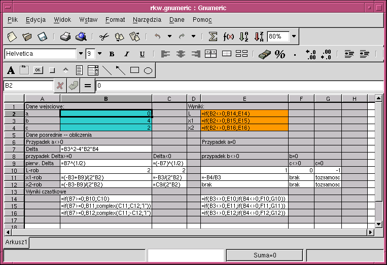 Ilustracja przedstawia przykładowy schemat rozwiązania równania drugiego stopnia za pomocą programu tego typu.